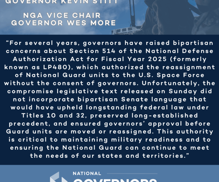 Press Releases 26 Nov 2025 Governors Issue Statement on Shooting of National Guard Members WASHINGTON, D.C. – NGA Chair Oklahoma Governor Kevin Stitt and Vice Chair Maryland Governor Wes Moore have issued the following… National Governors Association